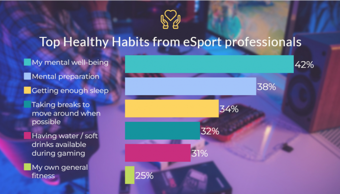 ويرى 48% من محترفي الرياضات والألعاب الإلكترونية أهمية أخذ وقت من الراحة أو استراحة للنوم أو تناول الطعام الصحي لتحسين أدائهم. وبالمقارنة، فإن 64% من كبار المؤثرين في عالم الألعاب يفضلون مواصلة اللعب على أخذ فترات استراحة.