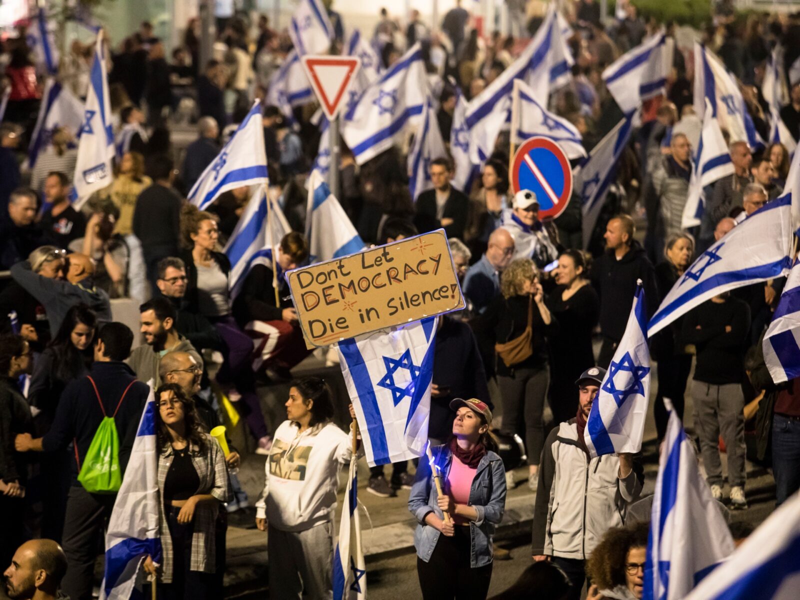 ورفع المتظاهرون العلم الإسرائيلي وشعارات تتهم بنيامين نتنياهو وحلفاءه من اليمين المتطرف والعنصريين والمتدينين المتشددين بالانقلاب على القضاء والسلطة والنظام السياسي والسعي لتحويله إلى دكتاتورية تهدر حقوق المواطنين.