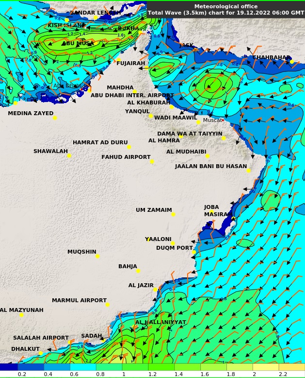 أفادت الأرضاد الجوية العمانية بارتفاع موج البحر (تزامنًا مع نشاط الرياح الشمالية الشرقية وفرص تدفق الغبار ) على السواحل الغربية لمحافظة مسندم وأجزاء من سواحل بحر عمان إلى متوسط الموج 2.0 متر مساء اليوم ويومي الإثنين والثلاثاء مع استمرار ارتفاع موج البحر على سواحل بحر العرب (متوسط/هائج 2.5 متر).