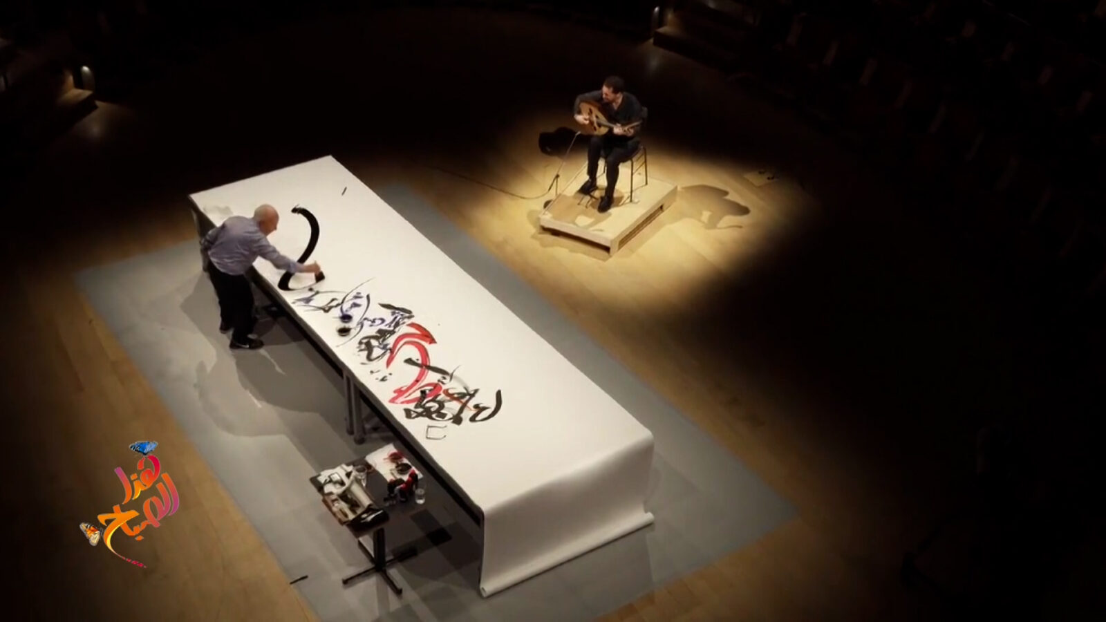 تناغم غير مألوف بين ريشة الخطاط وأوتار العود تبدع على الورق لوحة أبجدية في لقاء فني بامتياز بين الفنان نصير شمة والخطاط التونسي نجا المهداوي في برلين.