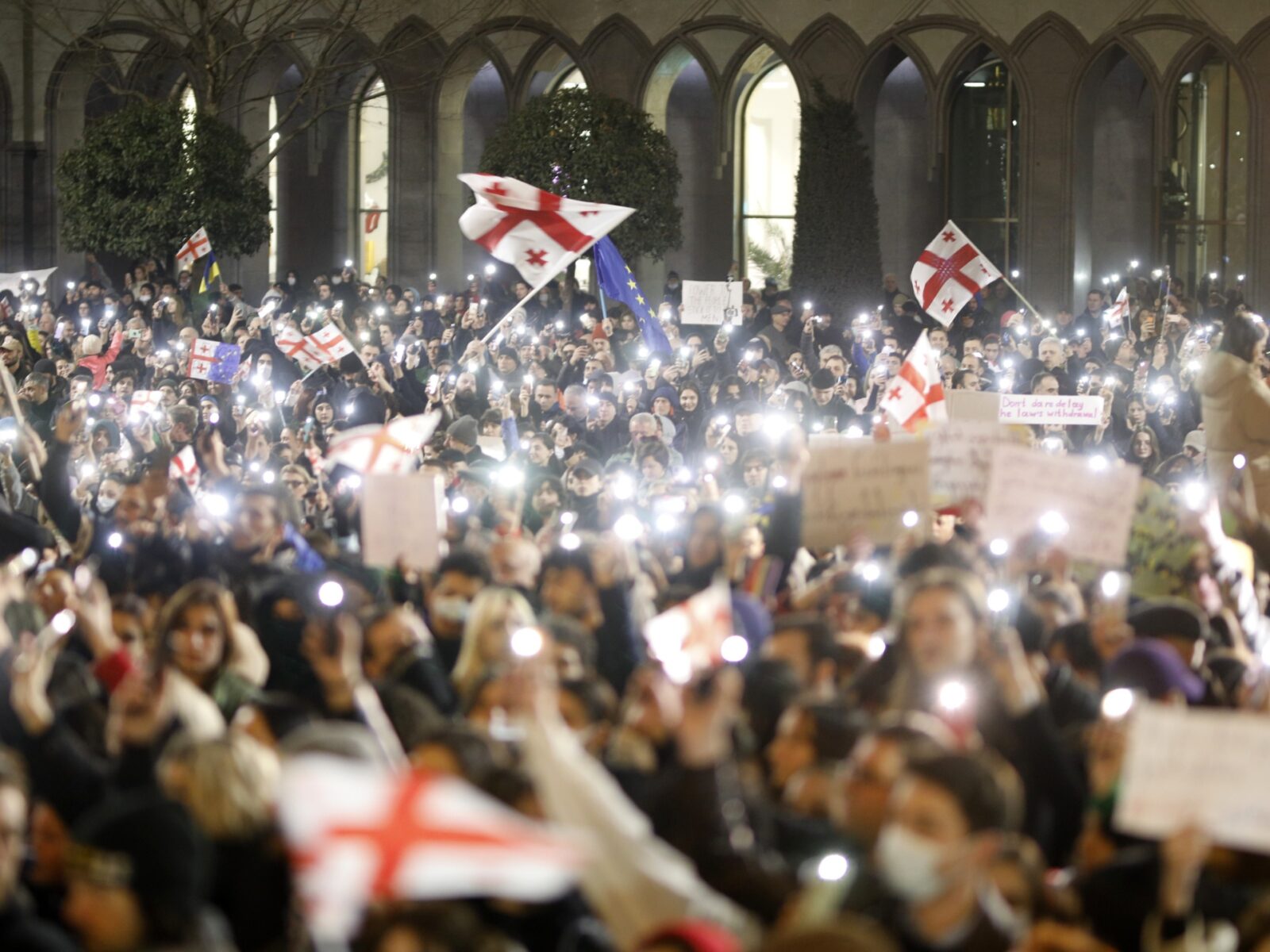 وبين الجموع المحتشدة في وسط تبليسي، لوّح كثيرون بأعلام جورجيا وأوكرانيا والاتحاد الأوروبي، ودان كثير من المحتجين الذين تجمعوا في وسط تبليسي سياسة الحكومة.