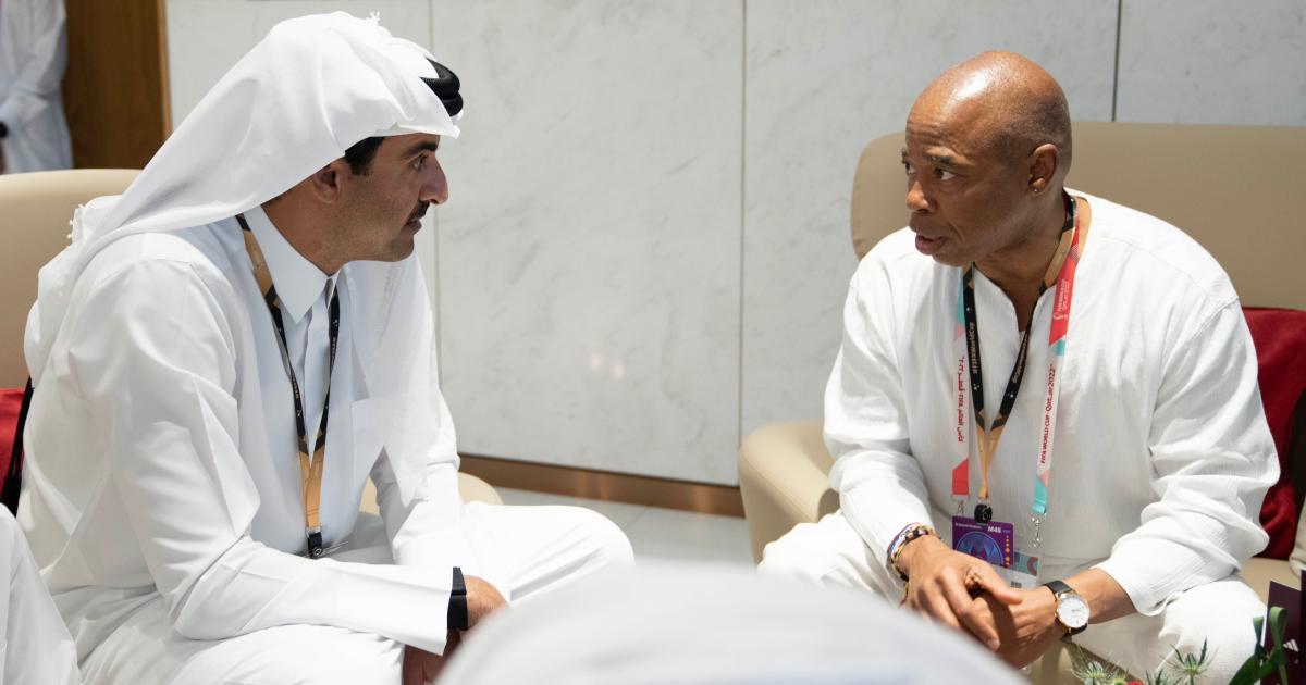 التقى حضرة صاحب السمو الشيخ تميم بن حمد آل ثاني أمير البلاد المفدى، مساء اليوم، في استاد الجنوب، مع سعادة السيد إيريك آدمز عمدة مدينة نيويورك، الذي يزور البلاد، لحضور جانب من مباريات بطولة كأس العالم FIFA قطر 2022.