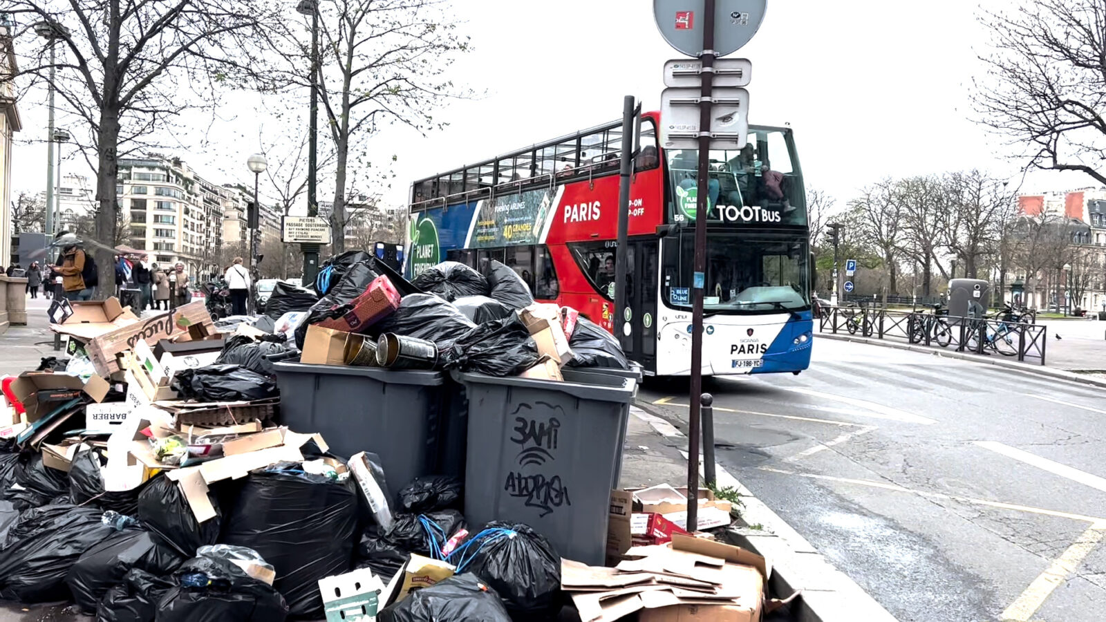 لكن عند العبور من هذه الدائرة الواقعة قرب منطقة برج إيفل، يمكن ملاحظة أن عددا هائلا من أكياس القمامة لا تزال مكدسة على أرصفة الشوارع وتنتظر دورها لانتشالها.