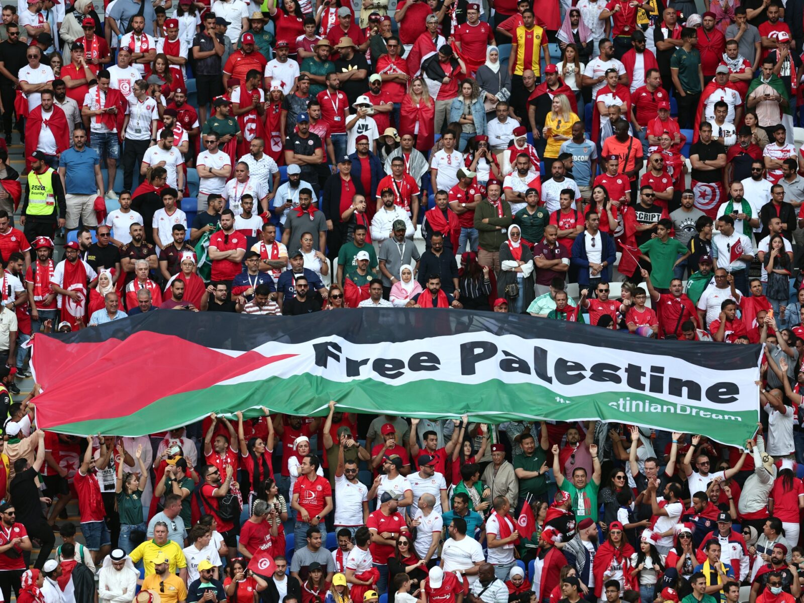 في مشهد المونديال -يقول الصحفيان- “وقف الفلسطينيون أو القطريون والتقطوا الصور ليسخروا منا، ولوّح المشجعون التونسيون بلافتة ضخمة كتب عليها “فلسطين حرة” خلال المباراة ضد أستراليا وتم رفعها في الدقيقة الـ48″، في إشارة إلى نكبة فلسطين في 1948.